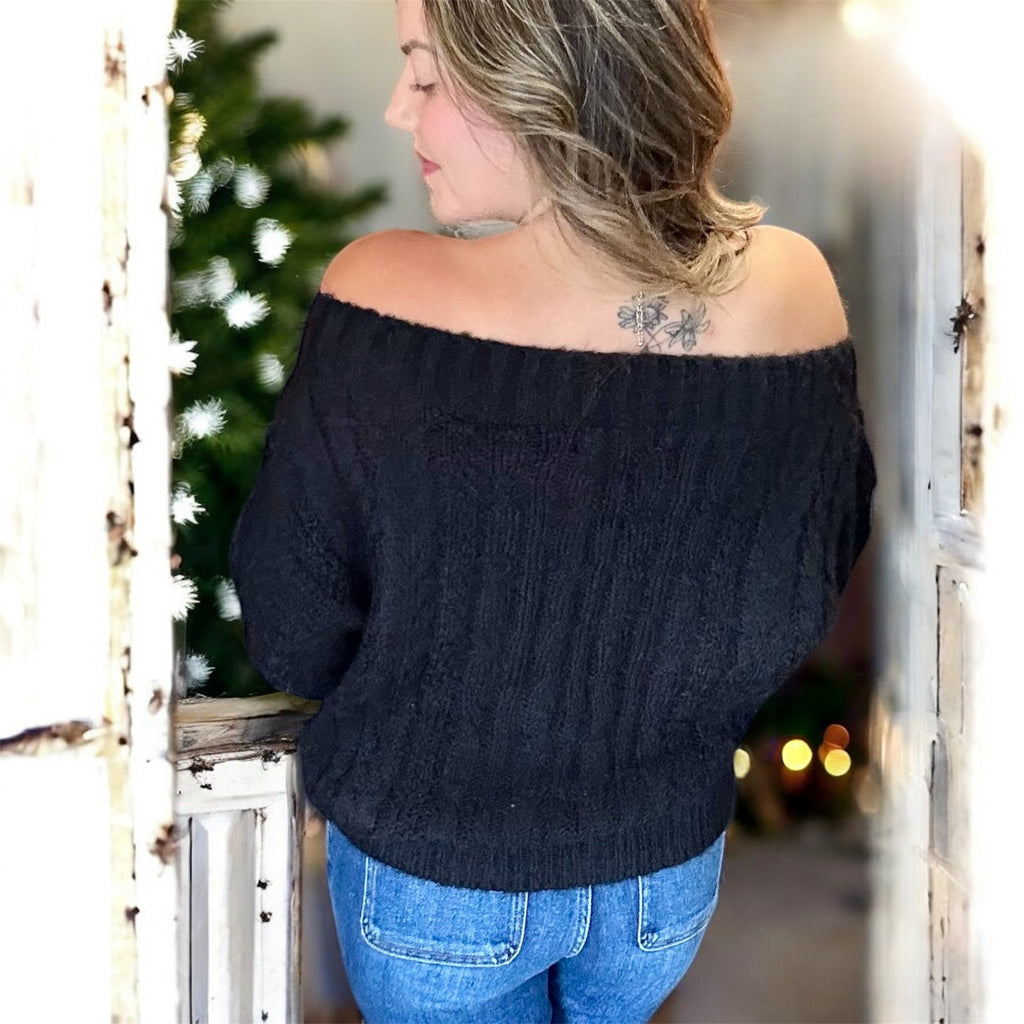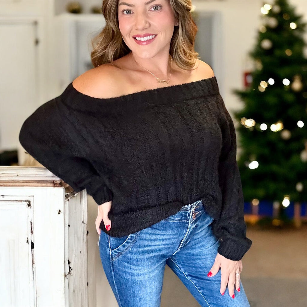 Wrap yourself in soft, snuggly texture with this rich mid weight knit. Designed with a wide neckline you can wear off the shoulder — but it looks just as cute worn normally — this sweater gives you options without any extra effort. The fit is relaxed, cozy, and perfect for holiday gatherings or a casual jeans-and-boots day.