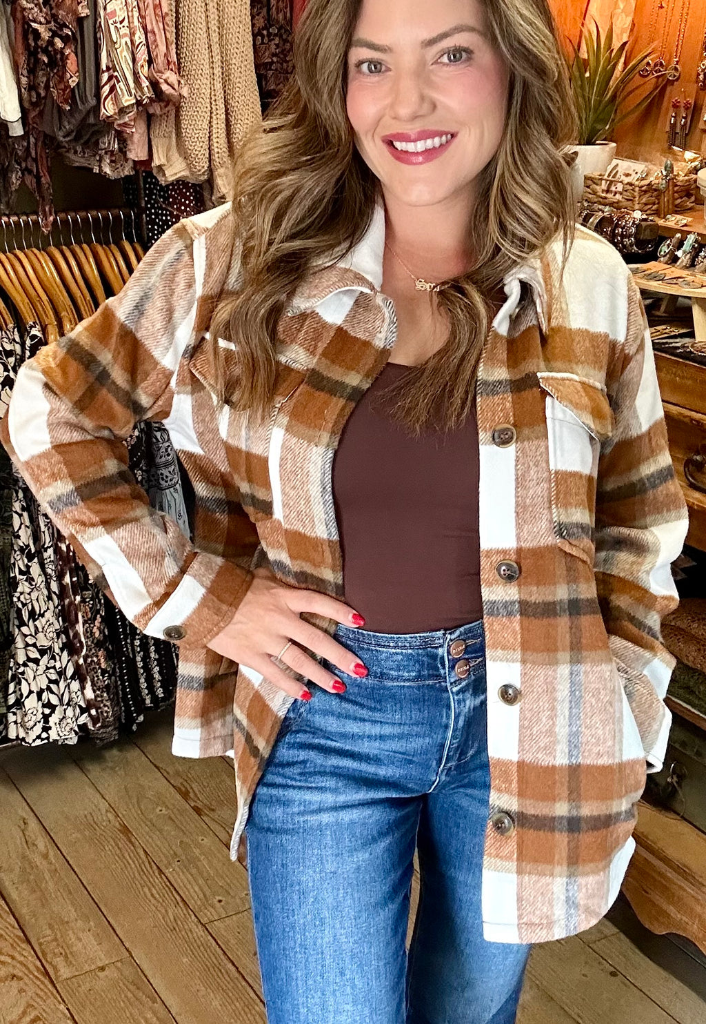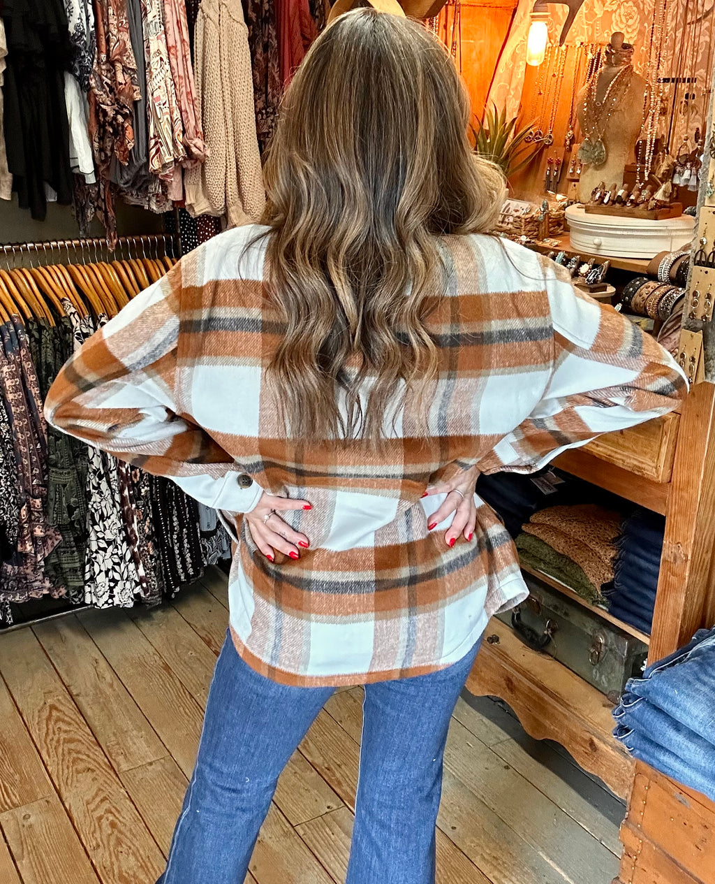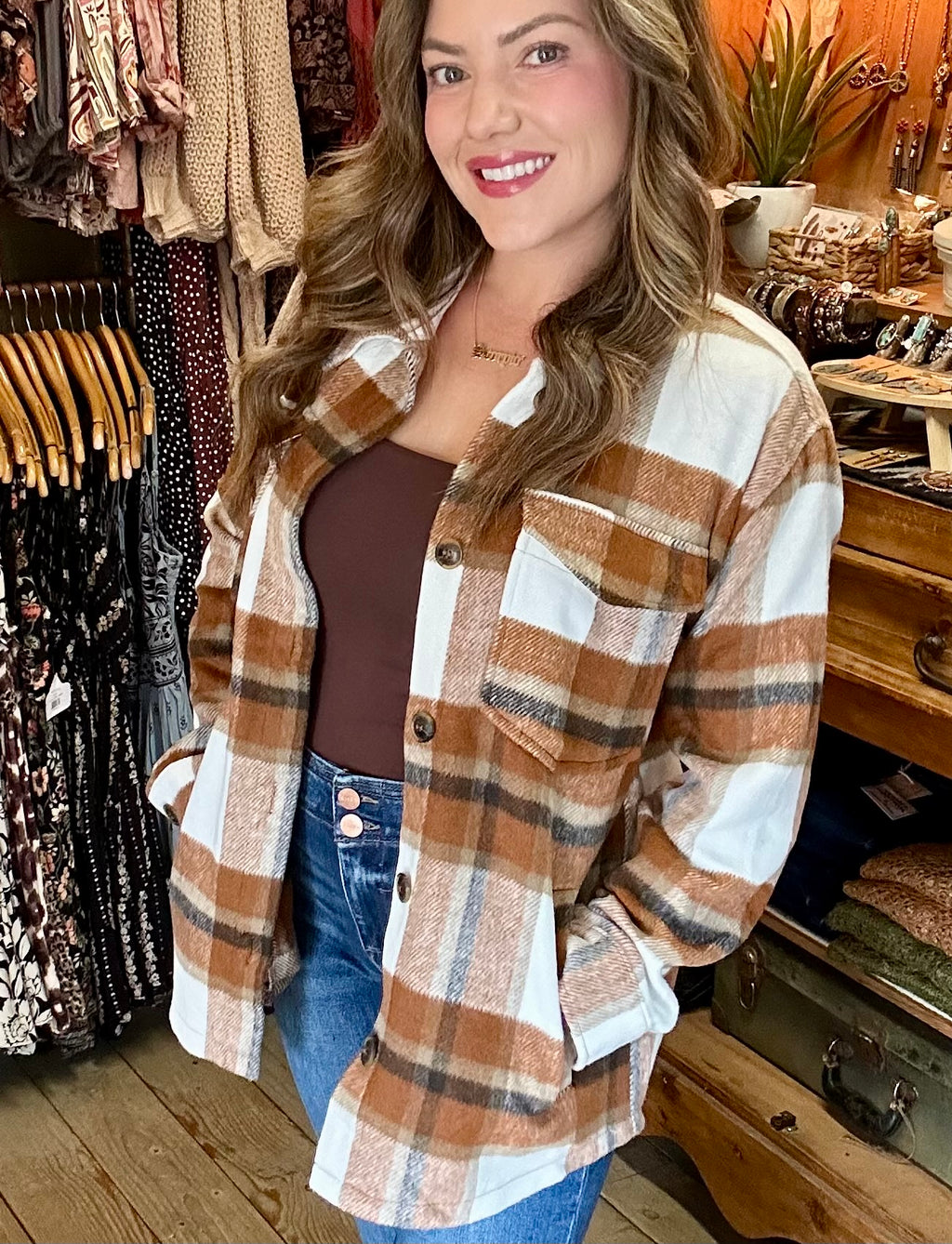A cozy western layer in a fresh winter color palette — warm neutrals and creamy accents that make it perfect for the season. This shacket is effortless to style, warm enough for cooler days, and adds just the right touch of laid-back western charm.