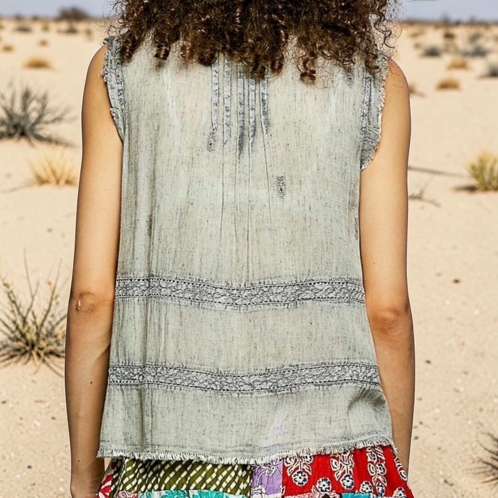 This tank carries that sun-faded, desert-washed feel with soft stitched texture that brings in a quiet boho edge.