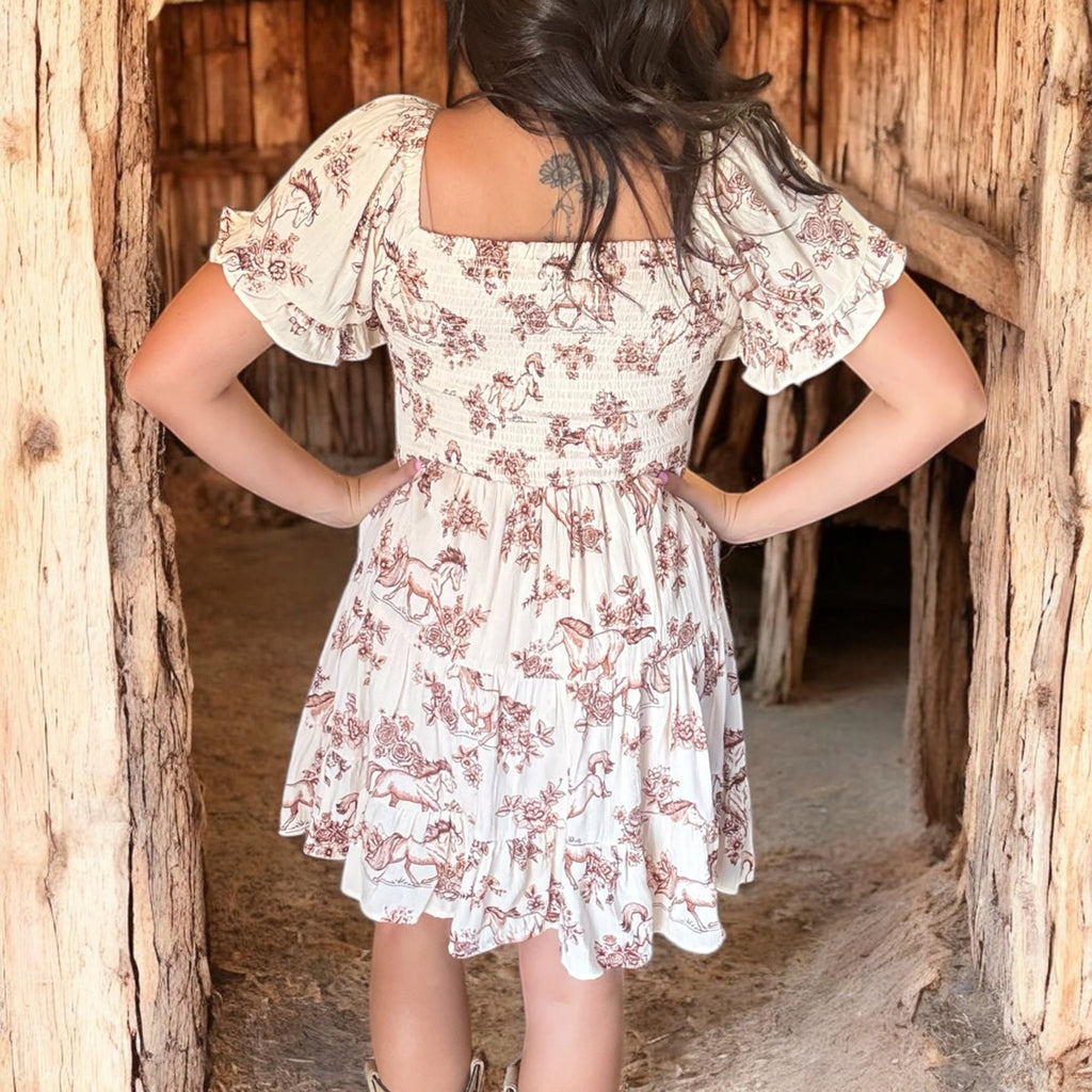 Feels like something you’d find hanging in an old ranch house and never want to give back. Soft ivory, quiet horse print, easy flow… and yes, it has pockets.