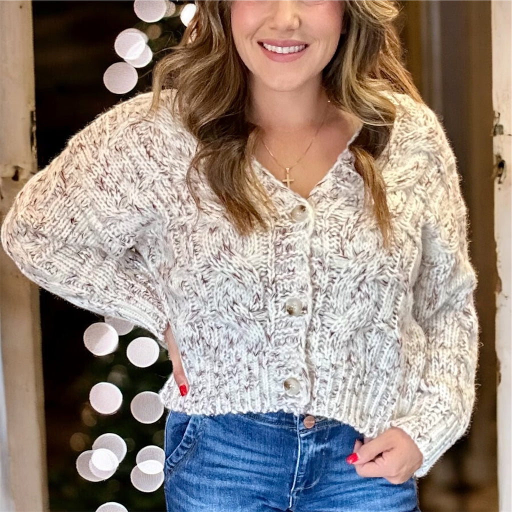 A soft swirl of winter texture, this cable-knit cardigan brings that dreamy, snow-day feel to any outfit. The marled yarn adds depth, the relaxed fit keeps it comfy, and the chunky knit gives it that boutique-level charm you love.