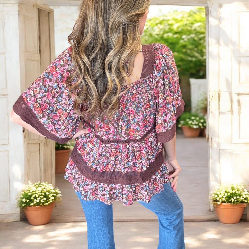 This top feels like something you found years ago and never stopped wearing. The vintage-style floral print, flutter sleeves, and that unexpected tie-back give it real personality without trying too hard. Easy, flattering, and just a little bit romantic in a worn-in way.