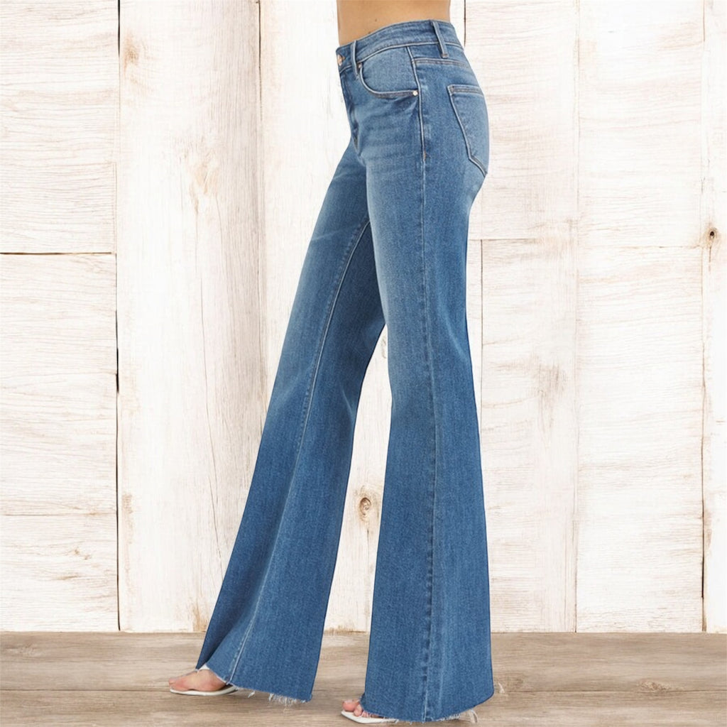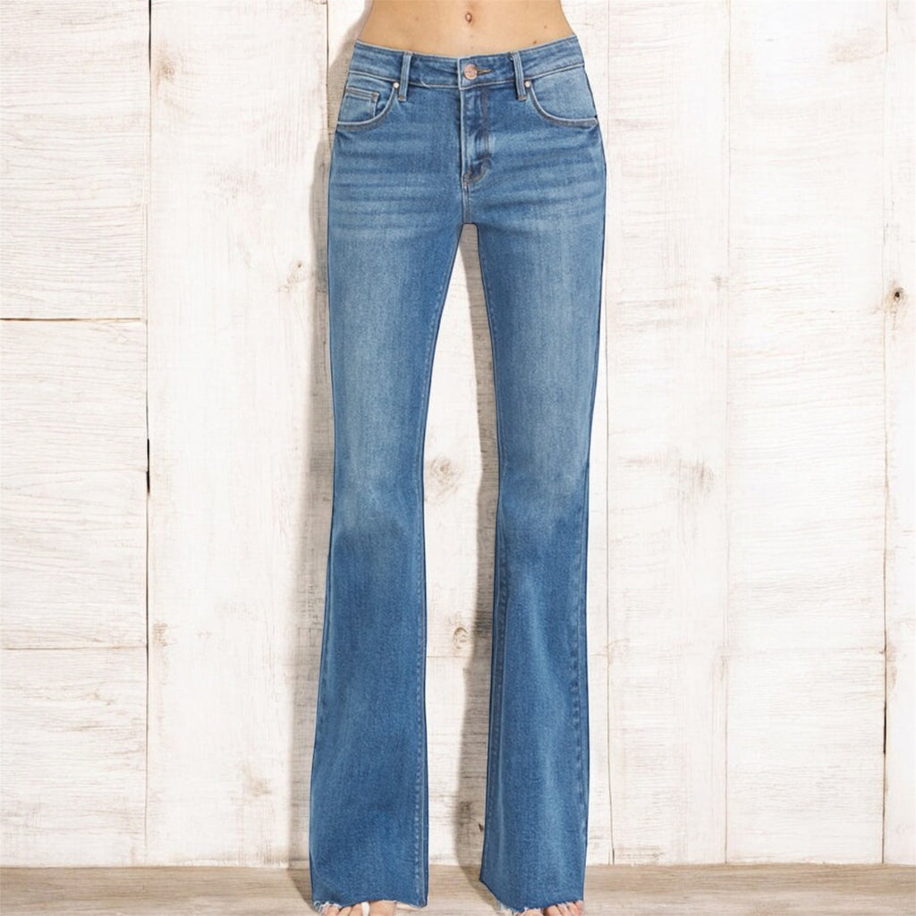 These flares are that perfect mix of vintage soul and everyday stretch comfort. Designed with a flattering mid rise and a subtle flare that lengthens the leg, the raw hem adds just the right touch of laid-back edge. Easy, effortless, and made to move with you — these are the jeans you’ll reach for on repeat.