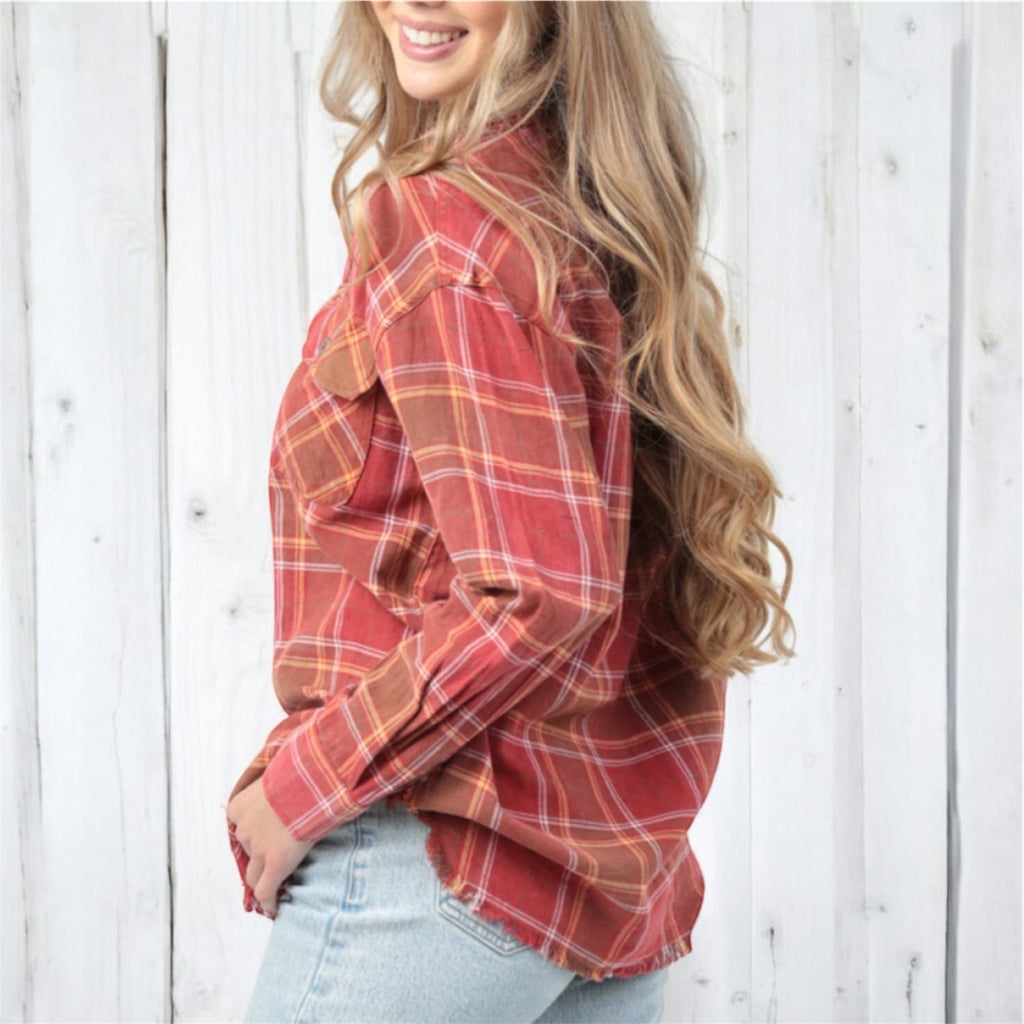 Soft, easy, and made for everyday wear. This red and rust plaid button-up has a lightweight feel, relaxed fit, and a raw frayed hem that gives it that effortless boutique look. It’s comfortable enough to wear all day and cute enough to style a dozen different ways.